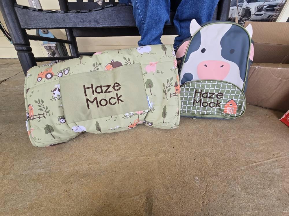 Kids Stephen Joseph All Over Print nap mat, backpack and Lunchbox Set. Personalize it with your child’s initials or name for no additional cost.